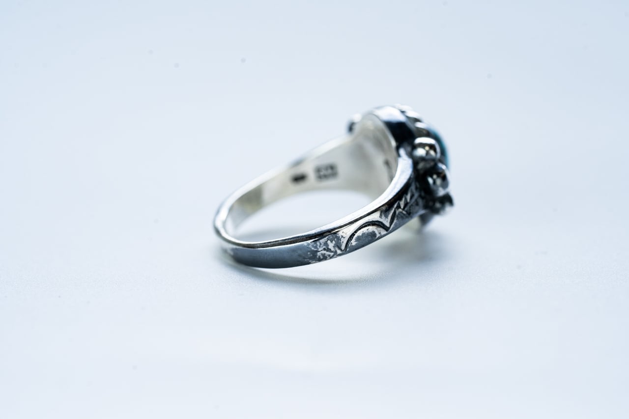 リングのサイドにはネイティブジュエリーの技法スタンプワークで手彫りの模様を彫り込んでいます。(鉄の棒を地道に削って模様を作り、スタンプのように銀の板に押し付けてデザインを入れていく技法)