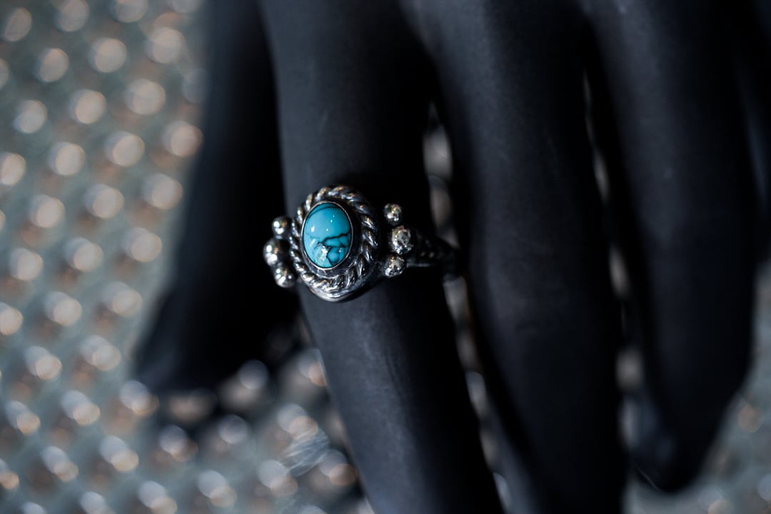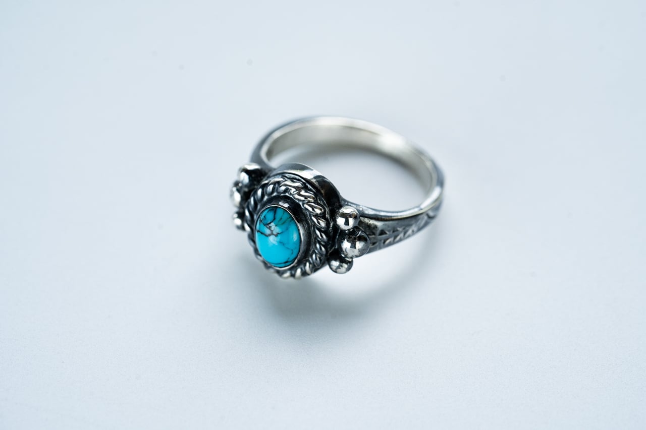 半貴石であるターコイズをSV925の縄付き覆輪(石留をするサークル)で留めたシグネットリング。