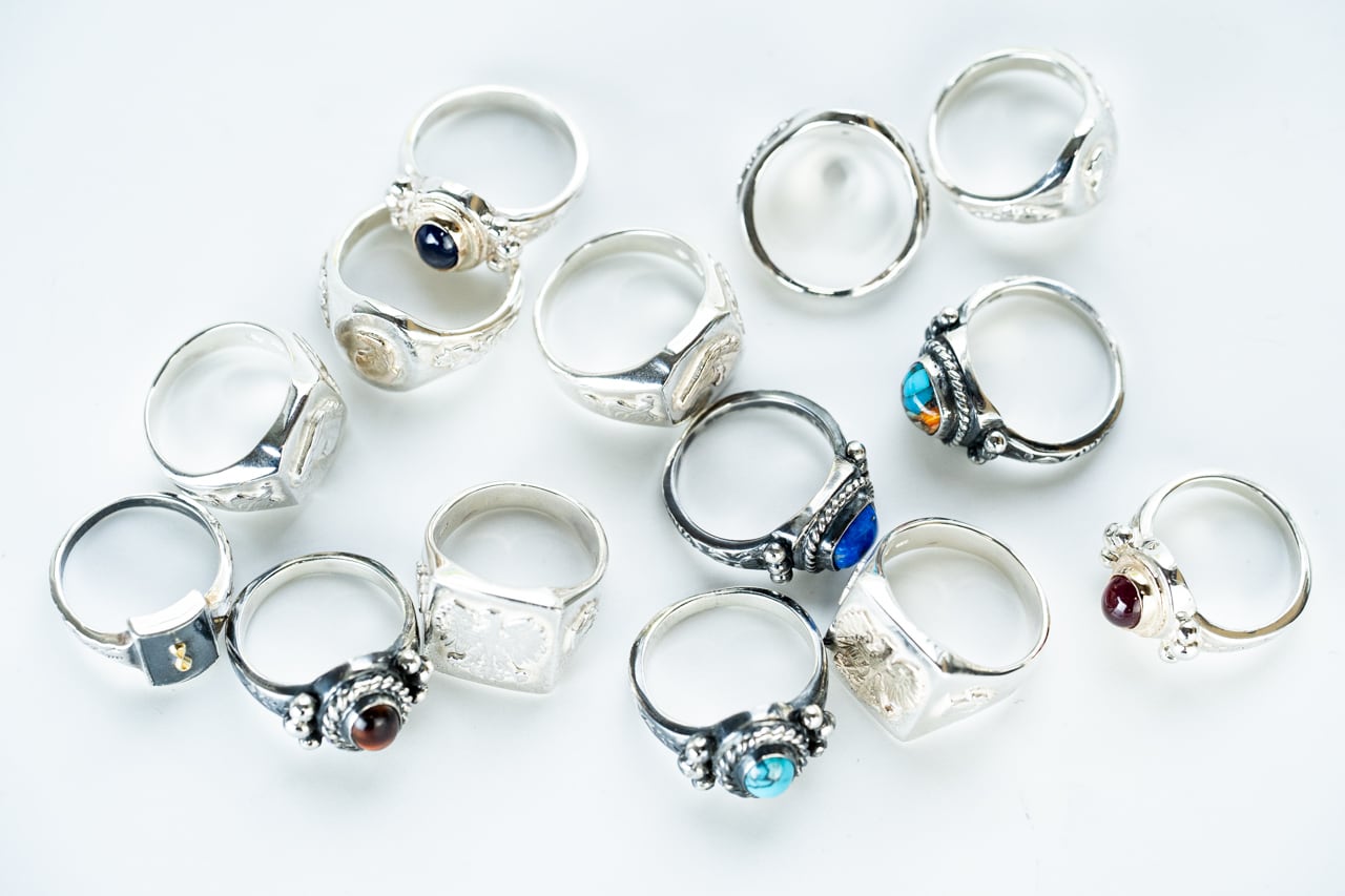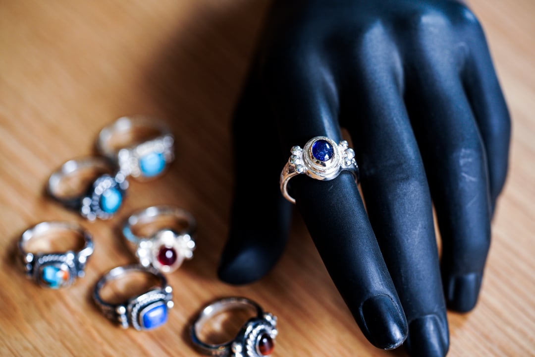銀の棒を細かく切り取り、熱して一点一点溶かし、丸くした銀の粒をリング脇の装飾として飾り付けています。