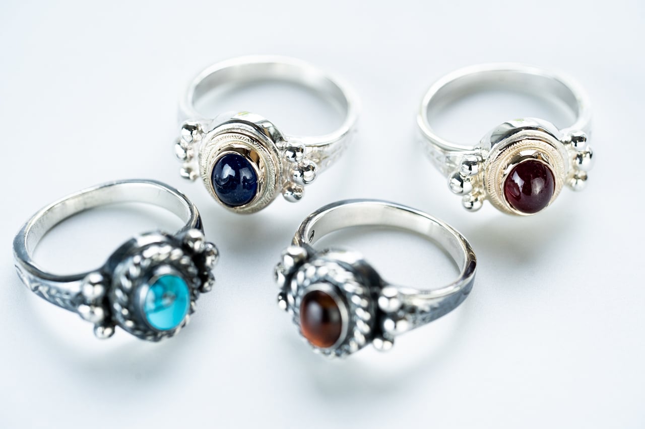 銀の棒を細かく切り取り、熱して一点一点溶かし、丸くした銀の粒をリング脇の装飾として飾り付けています。