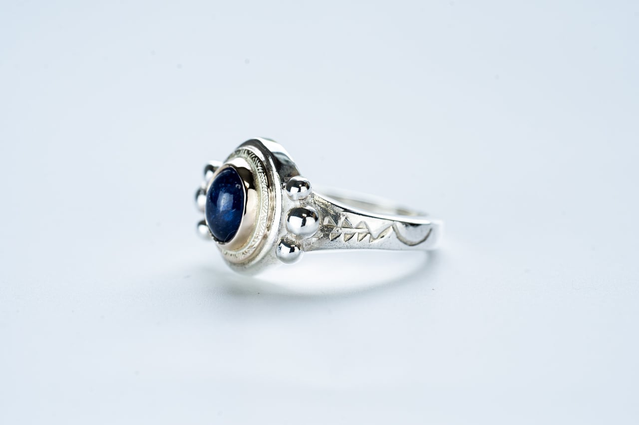 貴石でもあるサファイヤをK10の覆輪(石留をするサークル)で留めた贅沢なシグネットリング。