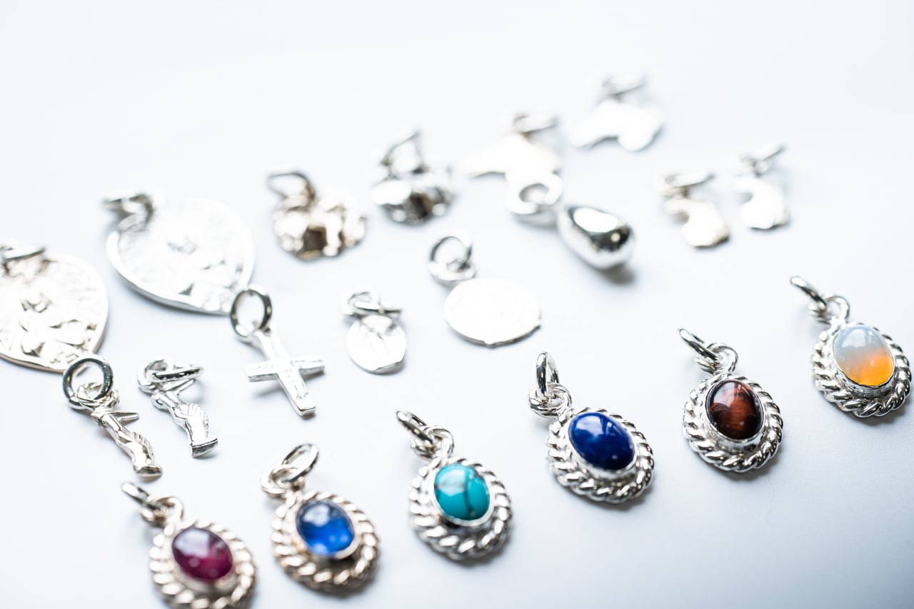 世界各国のアンティークコインをベースにしたチャーム、ネイティブジュエリーに関連する半貴石や更にはルビーやサファイヤといった貴石も使用し、様々な種類のチャームからお好みの物をお選びいただきネックレストップに装着可能です。